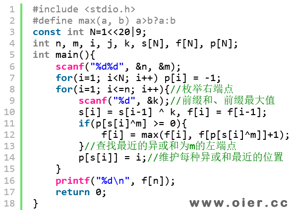 f[i]表示前i个数的最优值,第i个数要么选要么不选。不选则f[i] = f[i-1],选的话则贪心找到异或和为m的最靠右的端点。