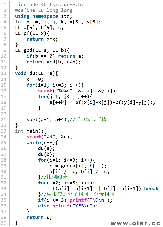 分类:数学 日期:02-03题目大意:输入两个三角形的三个顶点左边,请问这两个三角形是否相似?(多组数据) 解题思路 三边成比例即相似,我们可以先算出三角形三条边的长度,排好...